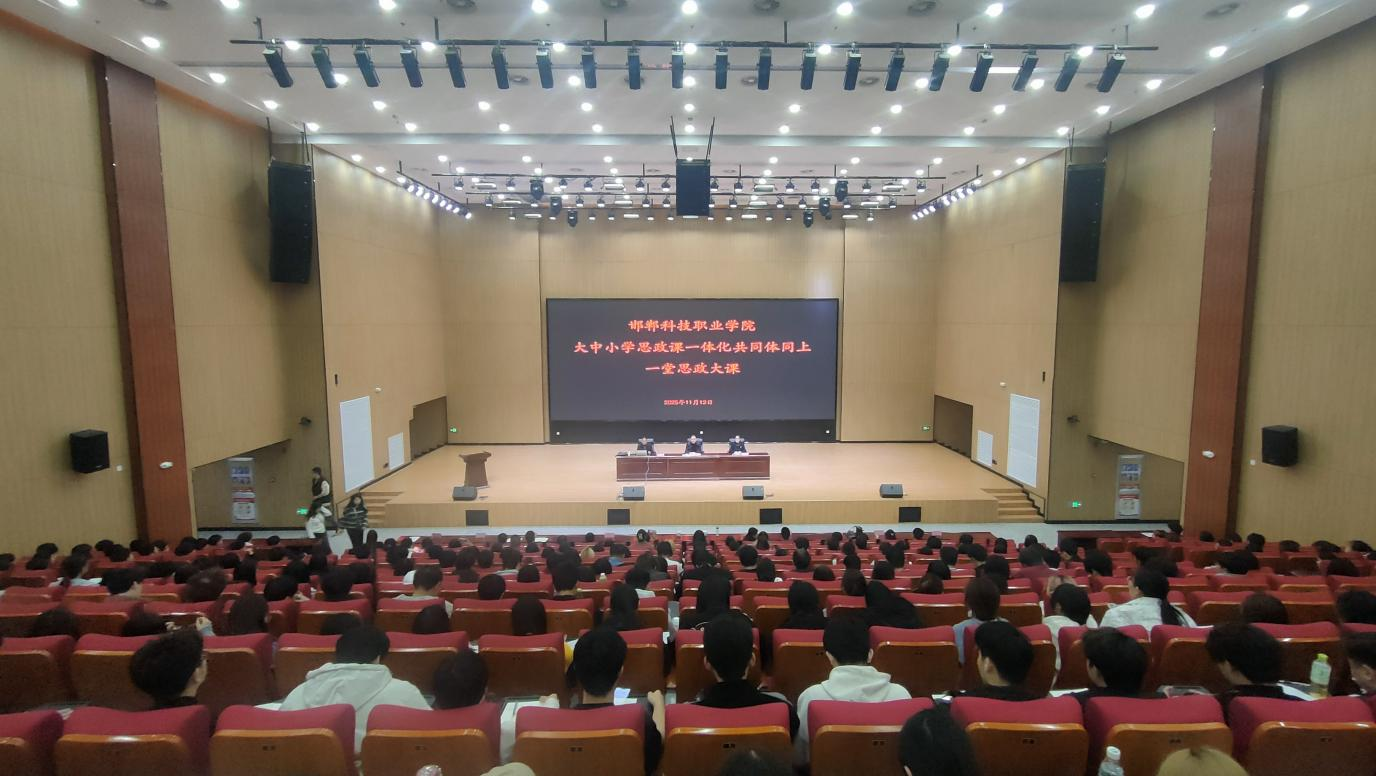 仪式后,直南党史馆馆长王志强作《星火燎原——传承红色基因,赓续红色血脉》专题报告。他以详实的史料、生动的叙事带领大家重温革命先烈追求真理、投身革命的壮阔历程,回溯直南地区烽火连天的峥嵘岁月。王志强作为革命先烈王子清同志的曾孙,深耕直南党史研究二十余年,宣讲经验丰富,对红色历史有着深刻理解与独到见解。此次聘任标志着校馆合作迈入新阶段,将为学校思政教育注入专业力量,助力思政课堂更具深度与活力,为大中小学思政课一体化建设添砖加瓦。 作为直南第一个共产党员,王子清用生命践行信仰、用热血浇灌理想的光辉事迹,让在场师生接受了一次深刻的思想洗礼与精神淬炼。报告不仅是一堂精彩的党史课,更为大中小学一体化联盟各校开展思政教学提供了鲜活范本。 学院马克思主义学院院长、邯郸科技职业学院大中小学思政课一体化共同体联盟单位800余名师生代表参加。
