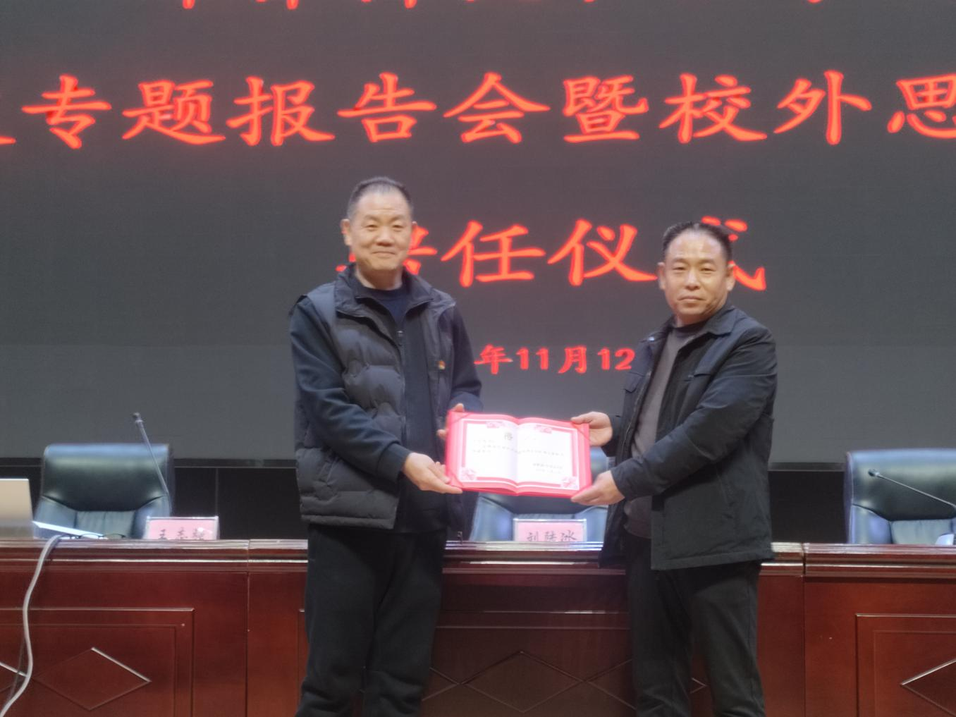 11月12日,学院在邯郸职教城国际学术交流中心二楼报告厅举办党史宣讲报告会暨校外思政导师聘任仪式。学院党委副书记刘陆冰参加。 刘陆冰向莅临现场的嘉宾、同仁及师生表示诚挚问候与感谢,深刻阐释了红色基因作为中国共产党人的精神密码和中华民族宝贵精神财富的时代价值。他说,学院始终将传承红色基因作为立德树人的核心任务,此次聘请王志强担任校外思政导师是推进校馆合作、完善一体化思政教育格局的重要举措。他向全体师生和共同体单位提出殷切希望,创新思政教育方式,让课堂成为传承红色基因的主阵地;从革命先辈事迹中汲取奋进力量;各单位加强合作,共同探索思政课一体化建设新路径。
