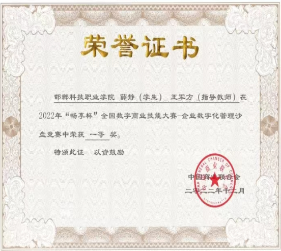 积极参加省和国家技能大赛,2022年,参加河北省职业院校大赛高职组工商企业管理综合技能(沙盘模拟经营)大赛,荣获团体一等奖,