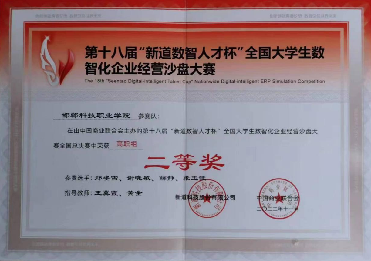 2023获得团体二等奖,2024荣获团体三等奖,2022年12月,指导学生参加中国商业联合会举办的第十八届“新道数智人才杯”全国大学生数智化企业经营沙盘大赛全国总决赛中荣获二等奖。