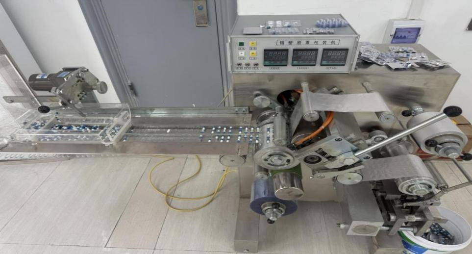 这一台大的仪器是全自动胶囊填充机,可以将所制好的药粉或颗粒精准填充到这个空心胶囊中,然后通过这边的泡罩包装机来将其封存至透明塑料薄片与铝箔之间。