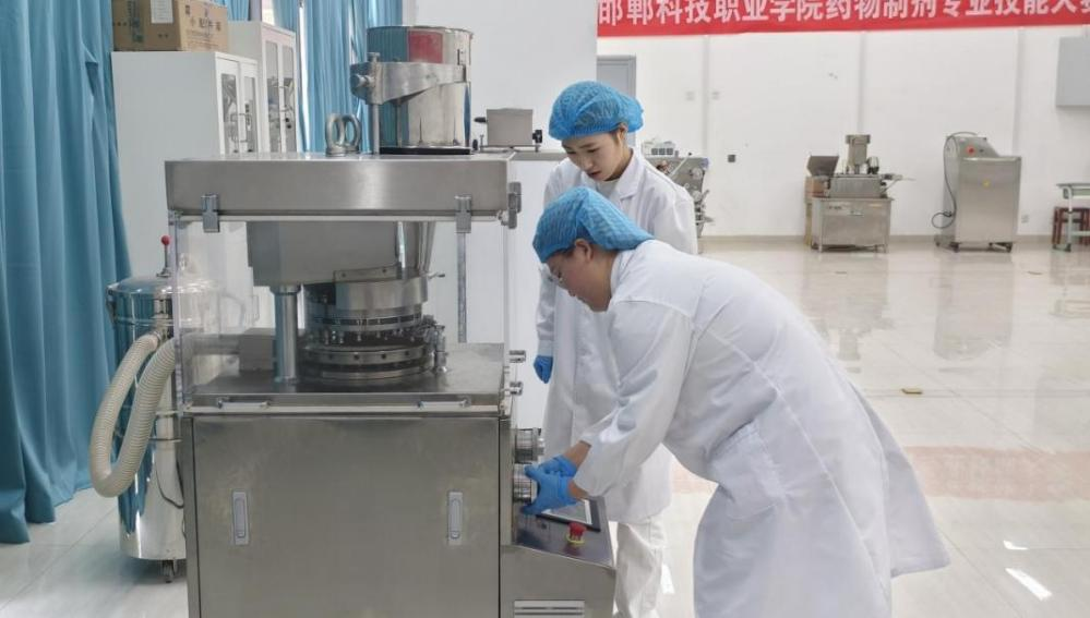 这台仪器呢是湿法混合制粒机,它可以直接制颗粒剂,训练喷剂控制和制粒时间控制技能;同时它制出来的颗粒剂也可以通过这个旋转压片机来制成片剂,那么这个大的仪器就是旋转压片机了。可以培训学生调整压力、片重、硬度等参数技能,才能把颗粒剂压制成片剂。