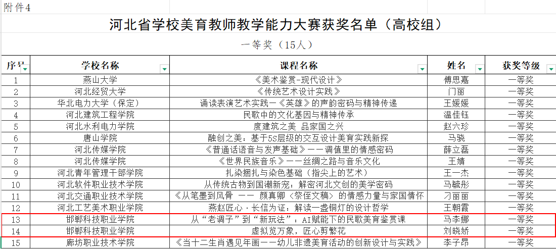 2025年河北省学校美育教师教学能力大赛获奖结果隆重揭晓。在这场高标准、严要求、强手云集的省级权威赛事中,本科与高职院校优秀教师同台竞技,学院一举夺得两项一等奖!