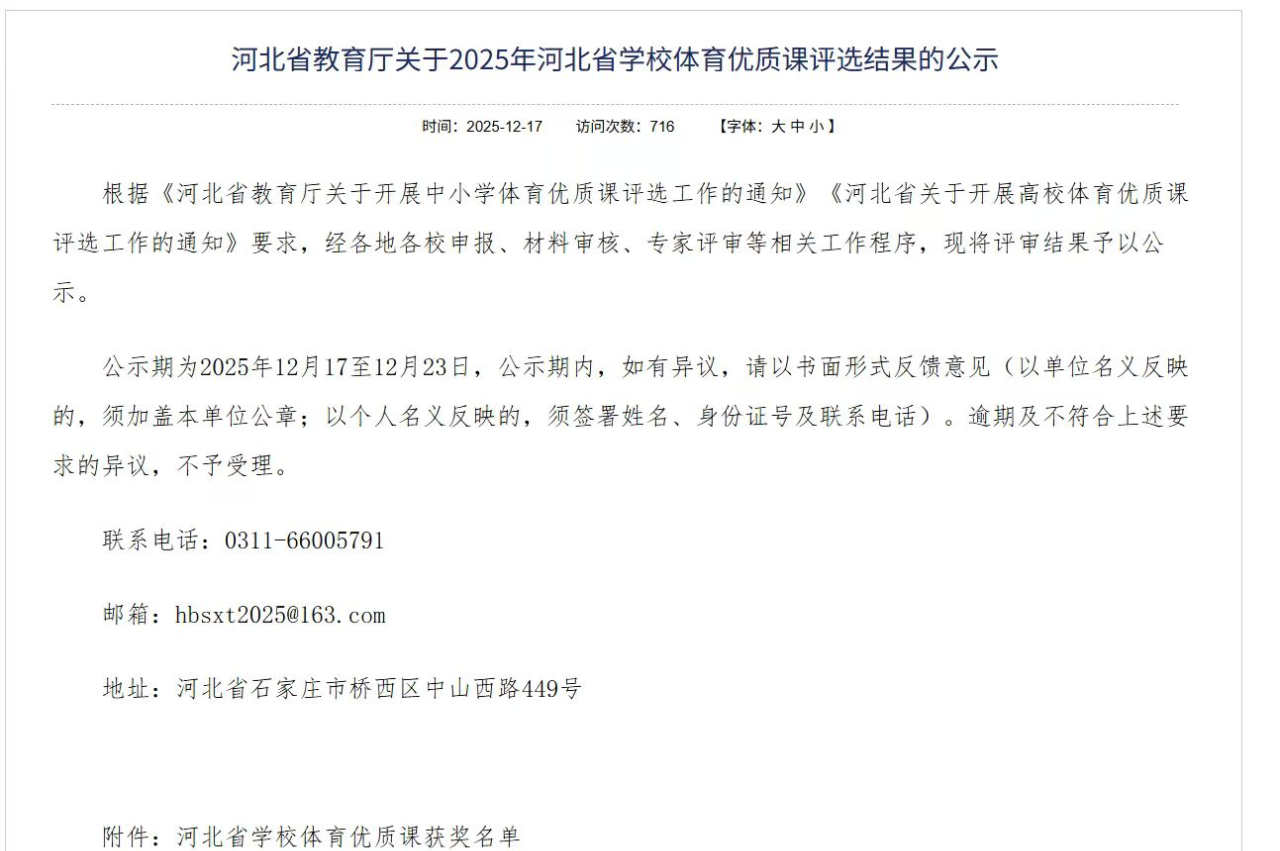 据了解,本次评选由河北省教育厅统一组织,旨在深入贯彻落实新时代学校体育工作要求,强化立德树人根本任务,推动体育课程改革创新,全面提升高校体育教学质量。评选经过学院推荐、省级专家综合评审等环节,最终评选出一批具有示范引领作用的优质体育课程。