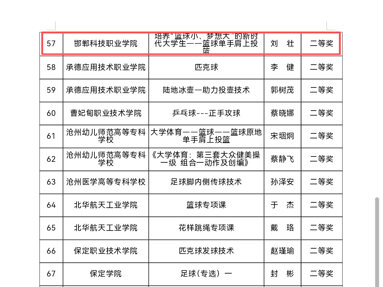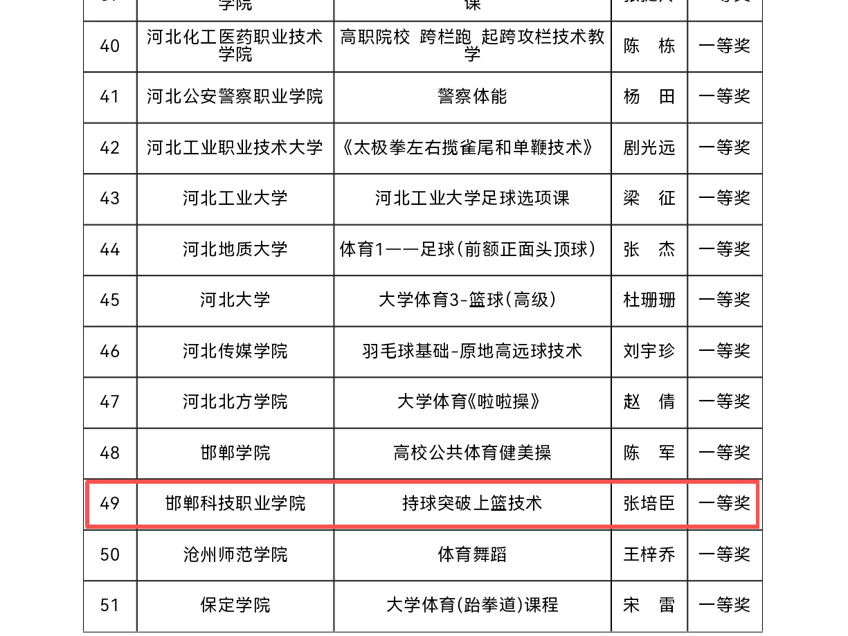 近日,河北省教育厅公布了2025年高等学校体育优质课评选结果。邯郸科技职业学院体育教师在评选中表现优异,荣获一等奖1项、二等奖1项!祝贺他们!