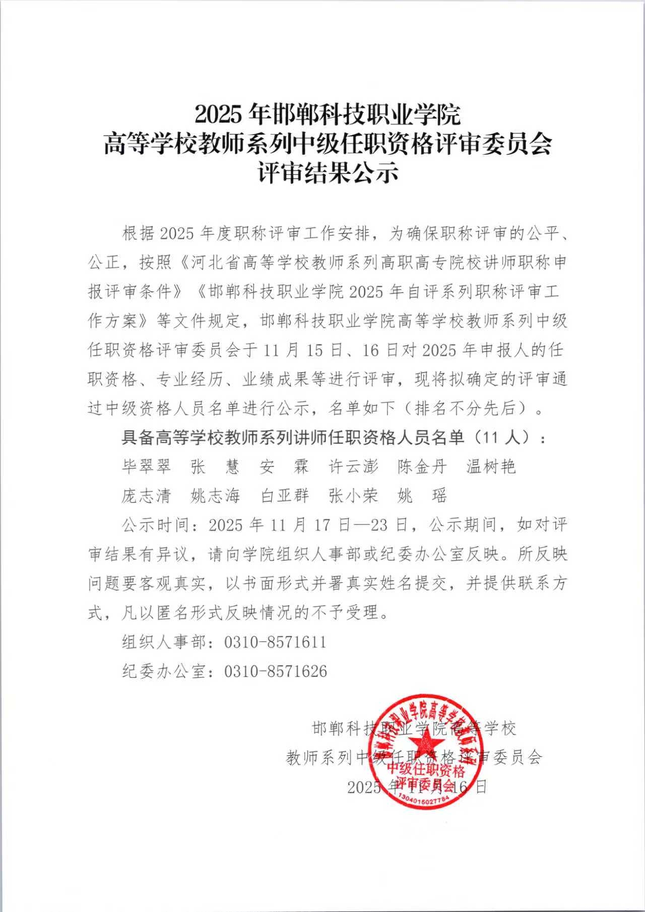 2025年邯郸科技职业学院高等学校教师系列中级任职资格评审委员会评审结果公示