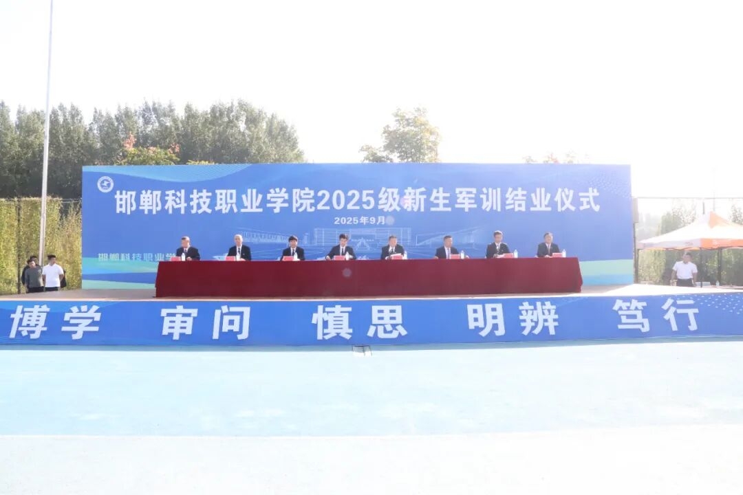 9月30日,邯郸科技职业学院2025级新生军训结业式在体育场隆重举行。学院领导李鹏丽、刘陆冰、任利民、王建军、薛刚、李亮、于保国、路毅出席,刘陆冰主持。学院各部门主要负责人,各教学系支部书记、学管办主任、团总支书记,学生工作部、团委全体工作人员,2025级辅导员、班主任参加。