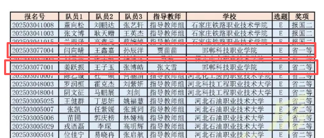 近日,2025年“高教社杯”全国大学生数学建模竞赛河北赛区成绩正式揭晓,邯郸科技职业学院贾苗苗老师指导的闫向晴、王鑫嘉、孙辰洋团队荣获河北省赛区一等奖;张文雪老师指导的姜跃振、王子玉、张博皓团队荣获河北省赛区二等奖,实现了学院在该项赛事中的新突破!祝贺他们!