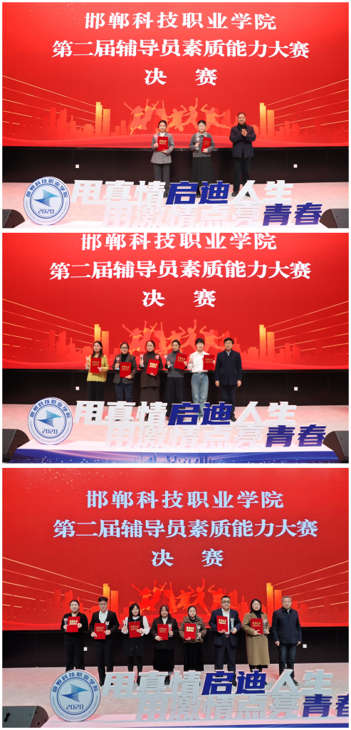 2026年1月4日,邯郸科技职业学院第二届辅导员素质能力大赛决赛在邯郸职教城国际学术交流中心一楼报告厅举行。大赛以“竞展育人风采、勇担铸魂使命”为主题,紧扣新时代高校思想政治工作新要求,全面检验辅导员队伍的理论水平、实践能力和职业风采,充分展现了学院学生工作队伍昂扬向上、奋发有为的精神风貌。经过激烈角逐,田梦晗、王钰涵获得大赛一等奖;史亮霞、崔冉冉、孙可欣、栗艳如、周烊彤获得大赛二等奖;冯尧、范旭阳、田春丽、王俊杰、赵海燕、荣宁宁、张政获得大赛三等奖!祝贺他们!
