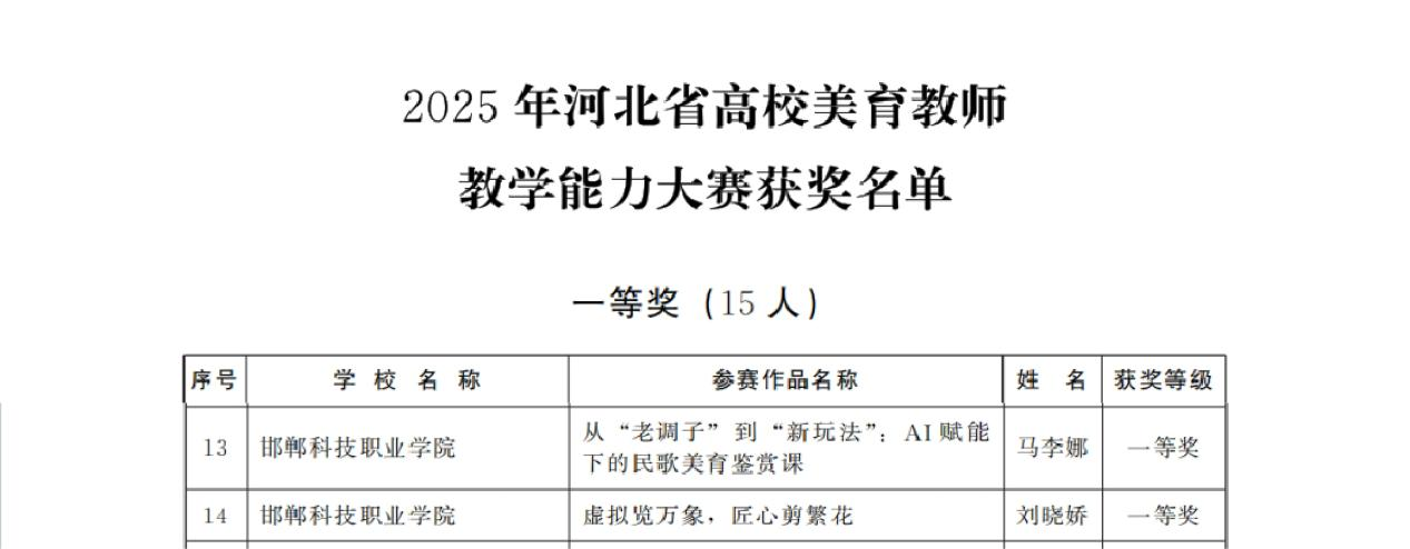 2025年河北省学校美育教师教学能力大赛获奖结果隆重揭晓。在这场高标准、严要求、强手云集的省级权威赛事中,本科与高职院校优秀教师同台竞技,学院一举夺得两项一等奖!