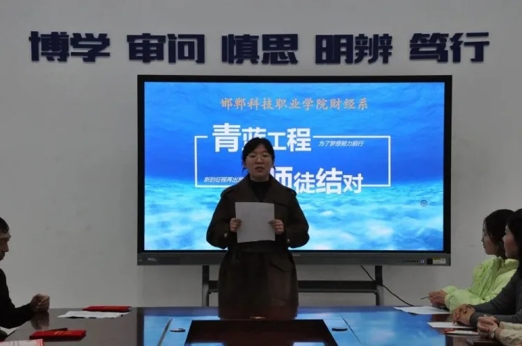 为加强对青年教师的培养,发挥以老带新、以新促老的团队互助作用,建设一支高水平、高素质的青年教师队伍。近日,邯郸科技职业学院财经系在D1 区111会议室举办“青蓝工程,师徒结对”活动,系领导,学科负责人及九对指导教师和青年教师参加了会议。