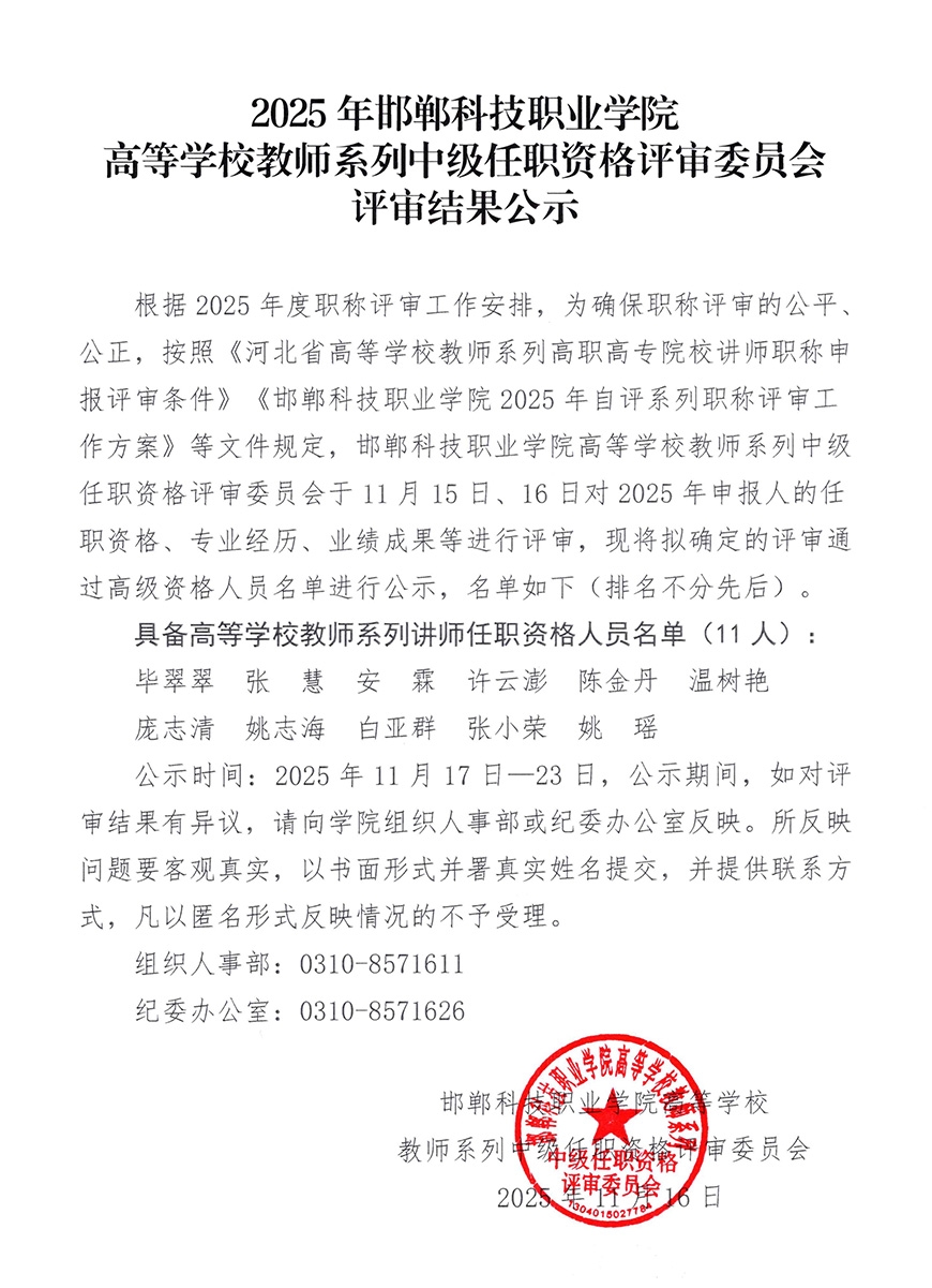 2025年邯郸科技职业学院高等学校教师系列中级任职资格评审委员会评审结果公示