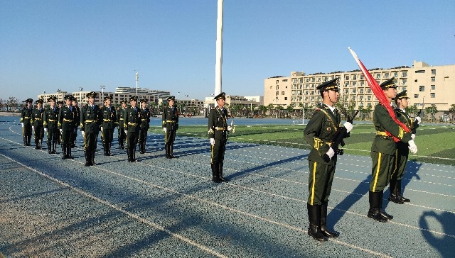在清晨的霞光中, 伴随着《义勇军进行曲》慷慨激昂的旋律,鲜艳的五星红旗冉冉升起。在场全体师生面向国旗行注目礼。